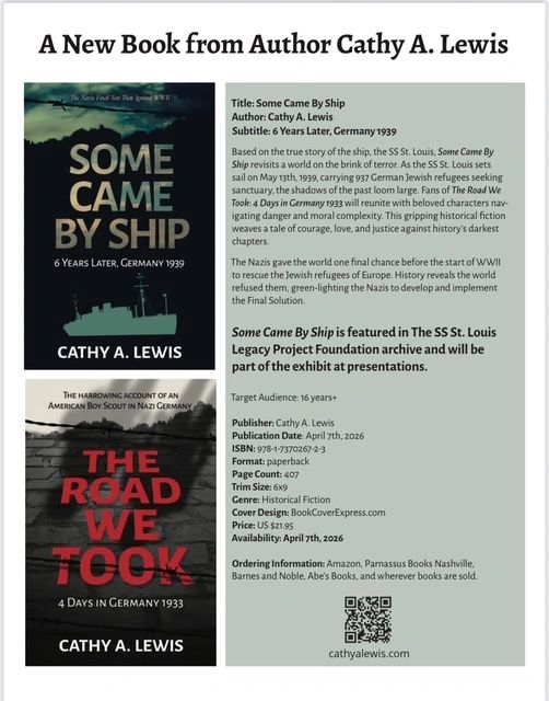 Cathy lives in Nashville Tennessee. She donates her resources to various charities including The SS St. Louis Legacy Project Foundation, Jewish Book Council, The Nashville Jewish Federation, Samaratins Purse, Home For Our Troops, Save Them All Animal Sanctuary and other local and national charities.